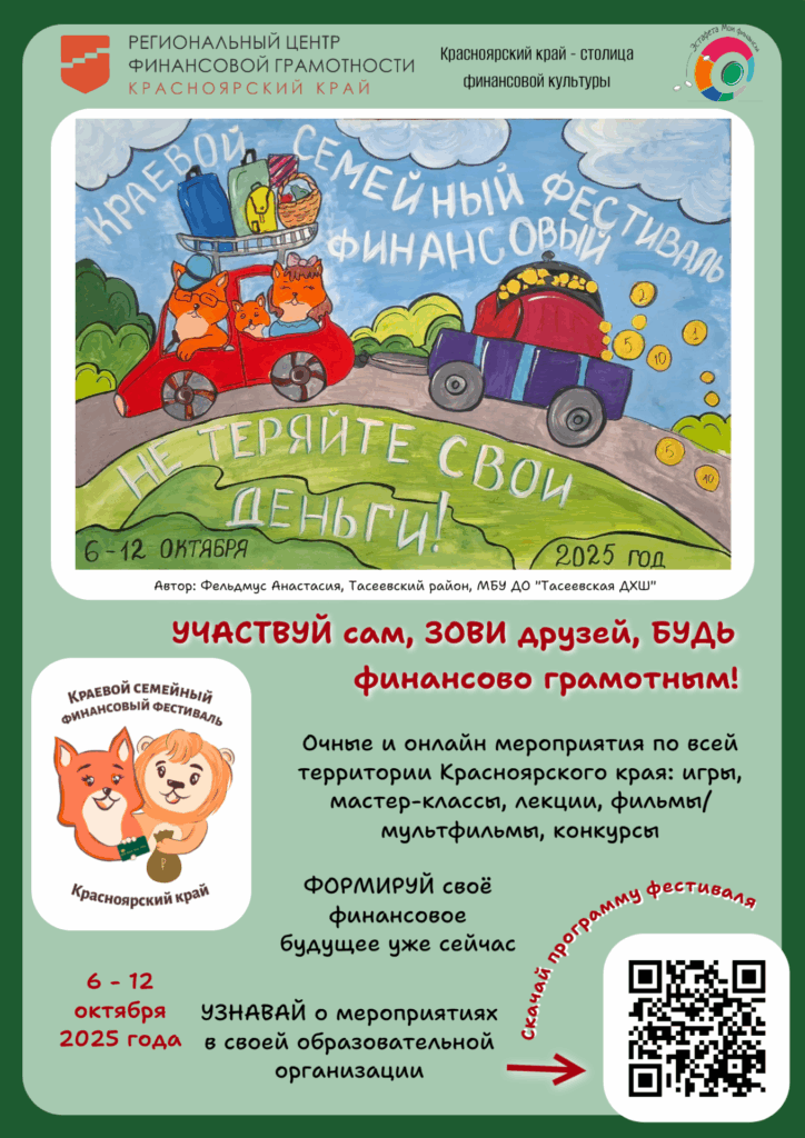 Приглашаем детей и родителей принять участие в VI Краевом семейном финансовом фестивале, который пройдет с 6 по 12 октября 2025 года в ваших образовательных учреждениях.